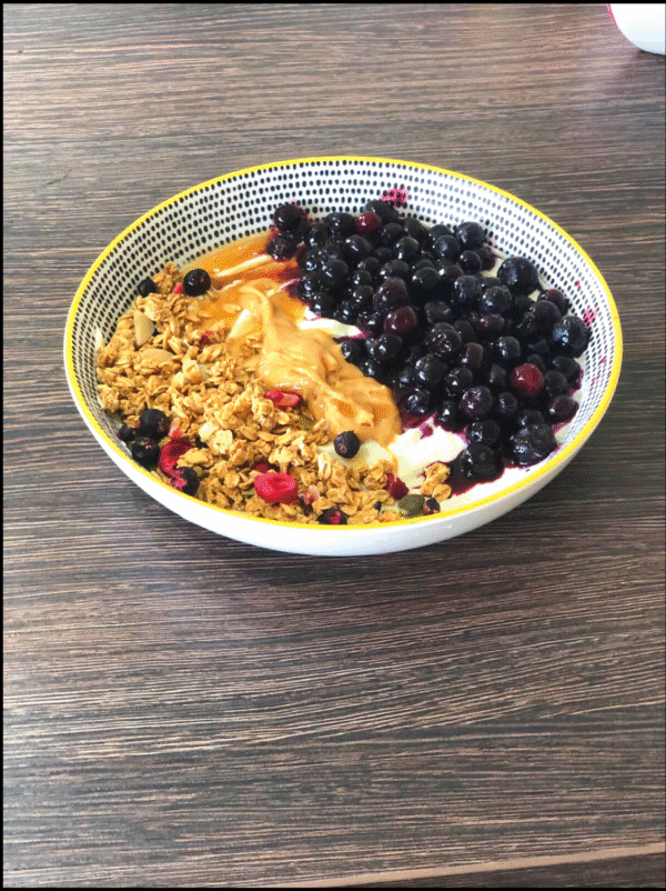 A creamy breakfast bowl with thick Greek yogurt, crunchy granola, and juicy berries, finished with a drizzle of cashew butter. Add a scoop of protein powder for an extra boost — quick, tasty, and ready in minutes.